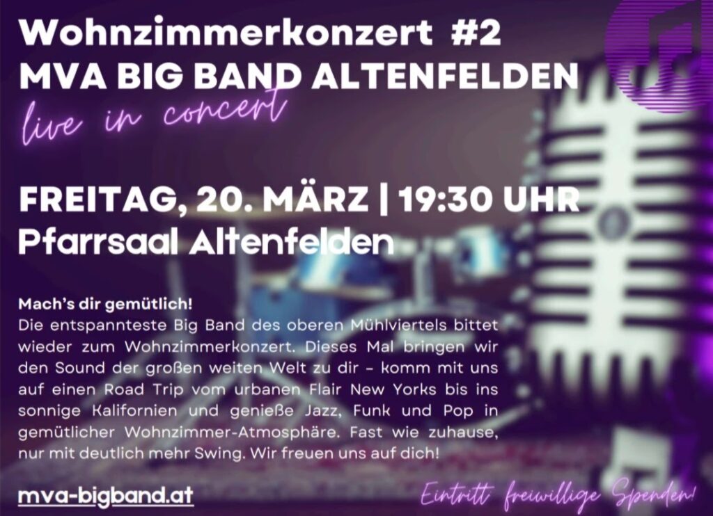 Termine 20.03.2026 - um 19:30 Uhr - Wohnzimmerkonzert im Pfarrsaal Altenfelden 20.06.2026 - um 20:00 Uhr - Eröffnung Sommerbühne Altenfelden